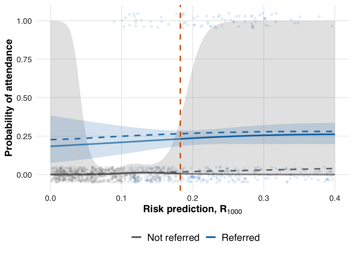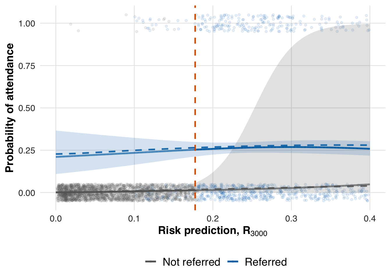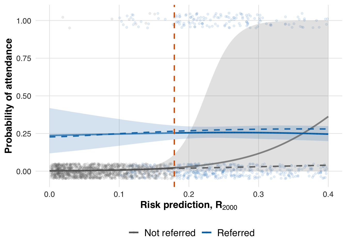 model_method_none <- list(type = "none")The outcome of interest in this scenario is whether a referred patient follows through and attends at least one visit in the prevention program. In practice, attendance reflects two forces: baseline risk and the incremental nudge from referral. We assume (i) patients with higher predicted risk are somewhat more likely to attend even without referral, but (ii) the incremental effect of referral exhibits diminishing returns—largest for mid‑risk patients and smaller for the very low‑ and very high‑risk. This captures the idea that low‑risk patients feel little urgency, while the sickest either face barriers or would attend regardless, so referral changes behavior least at the extremes.