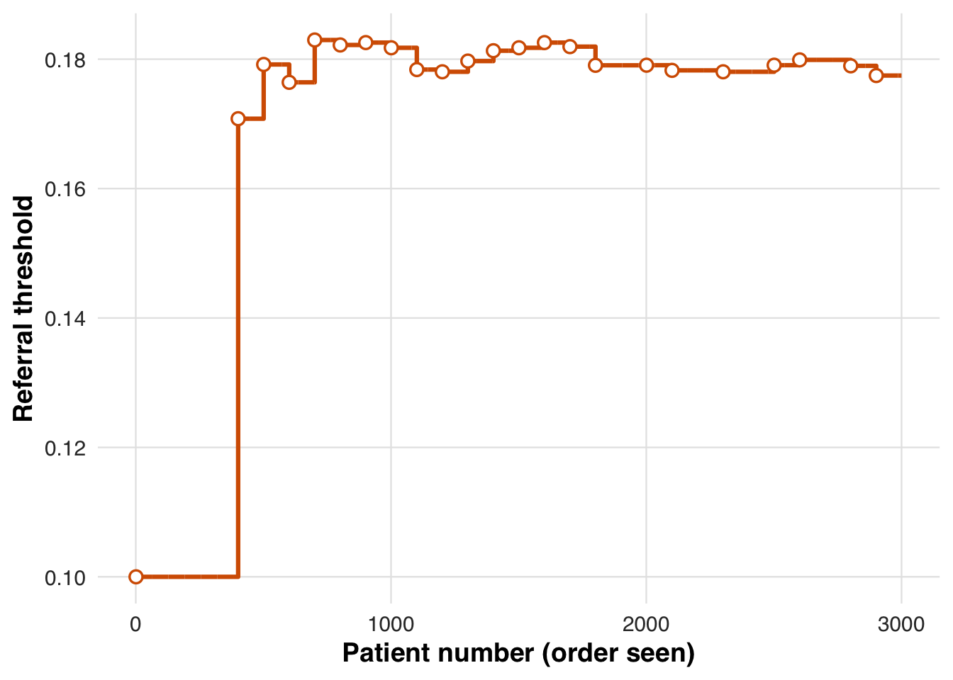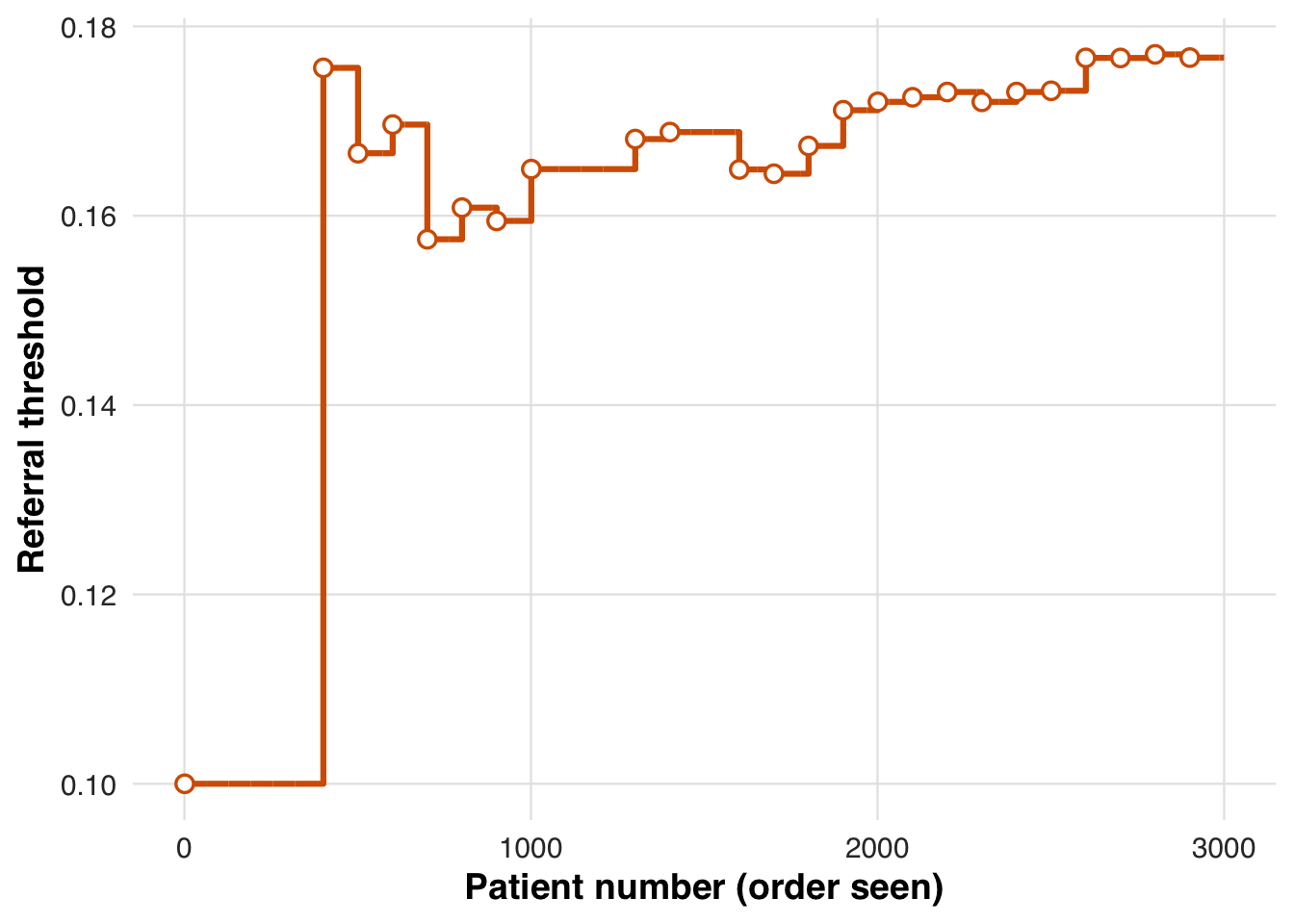 | Threshold adaptation | Threshold chosen to target specific referral rate or desired NNT |