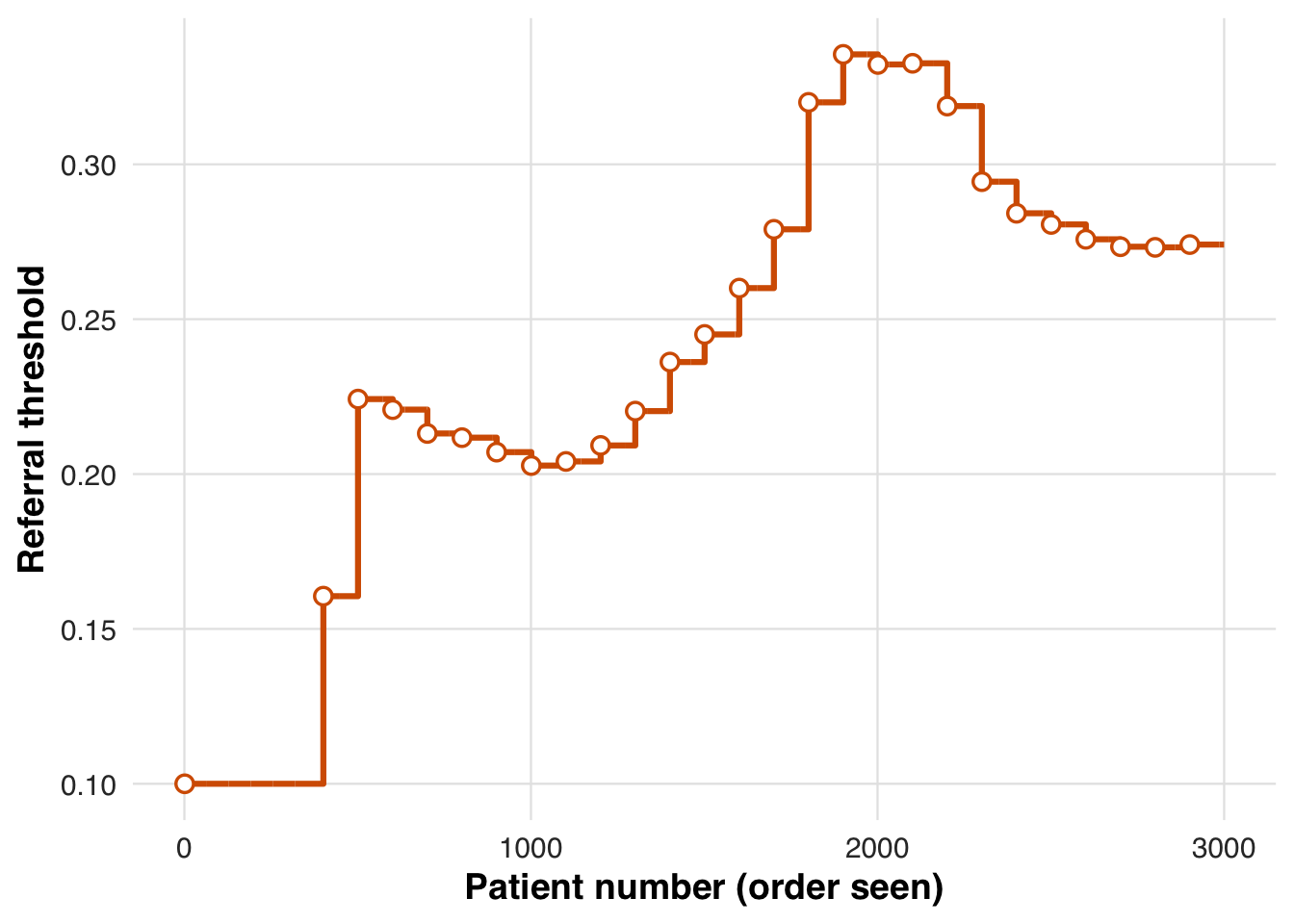 )The threshold trajectory shows how the system adapts under capacity constraints. After early fluctuations, the threshold stabilizes, indicating the referral rate has aligned with the target proportion.