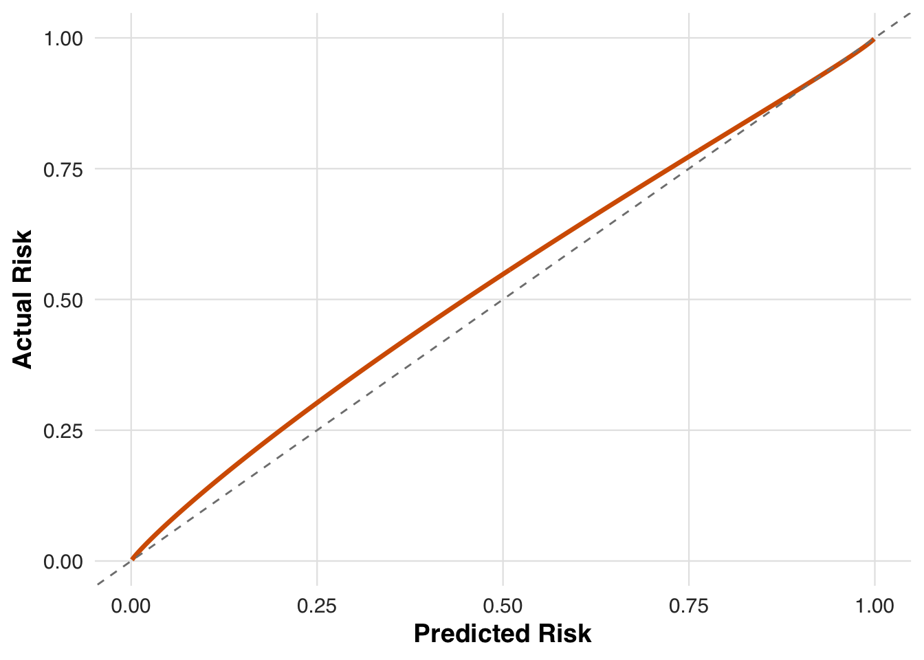 }We visualize the mismatch between predicted and true risk by plotting how the affine transformation alters the original predictions. The model tends to underestimate risk for higher-risk patients and overestimate it for lower-risk ones, motivating the need for recalibration.