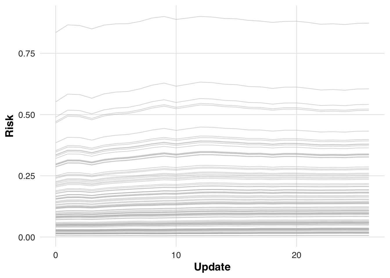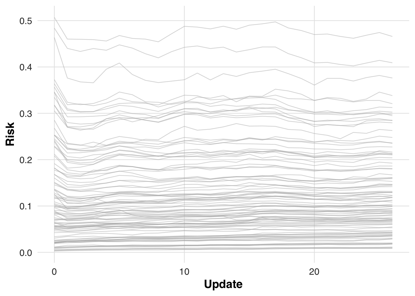 The code block below specifies the model revision strategy. Starting from the original PCE coefficients, we remove the terms for race and gender and use the revised model to compute updated risk scores. The shrinkage factor is again applied to gradually blend the revised coefficients with the original ones as more data accumulate, providing a smoothed transition away from demographic-based predictions.